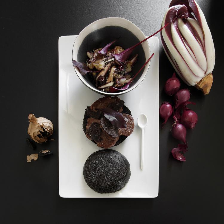 St Jacques crues avec aïoli aux truffes sur toast noir, endives rouges, radis noir, feuilles de moutarde et truffe en tranches.