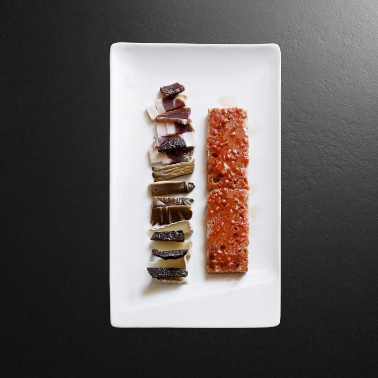 pane, pumata è prisuttu. toast de tomates fraîches avec jambon de Corse coupé épais, pleurotes au fromage de brebis et truffe.