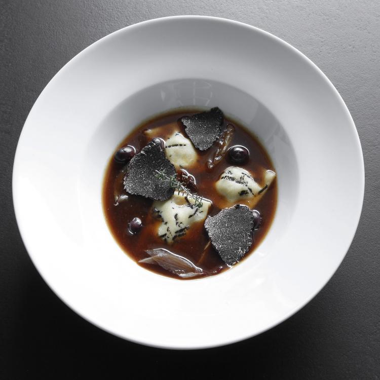 raviolis de cerf avec pâte à la truffe maison, sauce bœuf et gibier et olives de Nice. truffe en tranches.