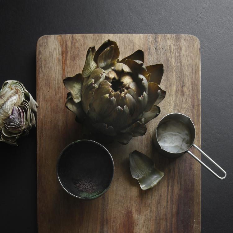 Purée d'artichaut et de fleur de betterave jaune et blanche, pétales de truffe. crème de sauce aux artichauts.