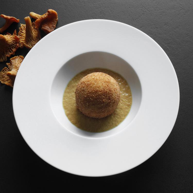 Croqueta de cerf et truffe avec lard de Colonnata et pleurotes royales. Fromage de brebis vieilli à la truffe.